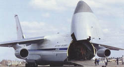 surveillance radar, forward-looking weather radar. The new version : An-124 was developed primarily as a strategic military freighter. An-124-100 certified by Russia in 1992 for commercial used. An-124-100 equipped with ZMKB Progress (previously Lotarev) D-18T engines (Ivchenko Progress Zaporozhye Machine-Building Design Bureau). An-124-100M equipped with western avionics. An-124-100M equipped with ZMKB Progress D-18T series3 engines which meet international noise and nitrous-oxide emission regulations. An-124-210 will be equipped with Rolls-Royce RB211-52H-T. The Antonov An-124 Ruslan was designed in the mid 1970 . The wings are high mounted, swept-back. The first prototype flew on 26 December 1982. The An-124 made its public debut at the Paris Air Show in 1985. The loads are positioned using two electric traveling cranes with total lifting of 44,100 lbs. The upper deck rear section is pressurized and can accommodate 88 troops. It has 24 wheel landing gear system (with two nose and ten main wheel bogies, five for each side, each bogie with two wheels) sharing the loads. | ||